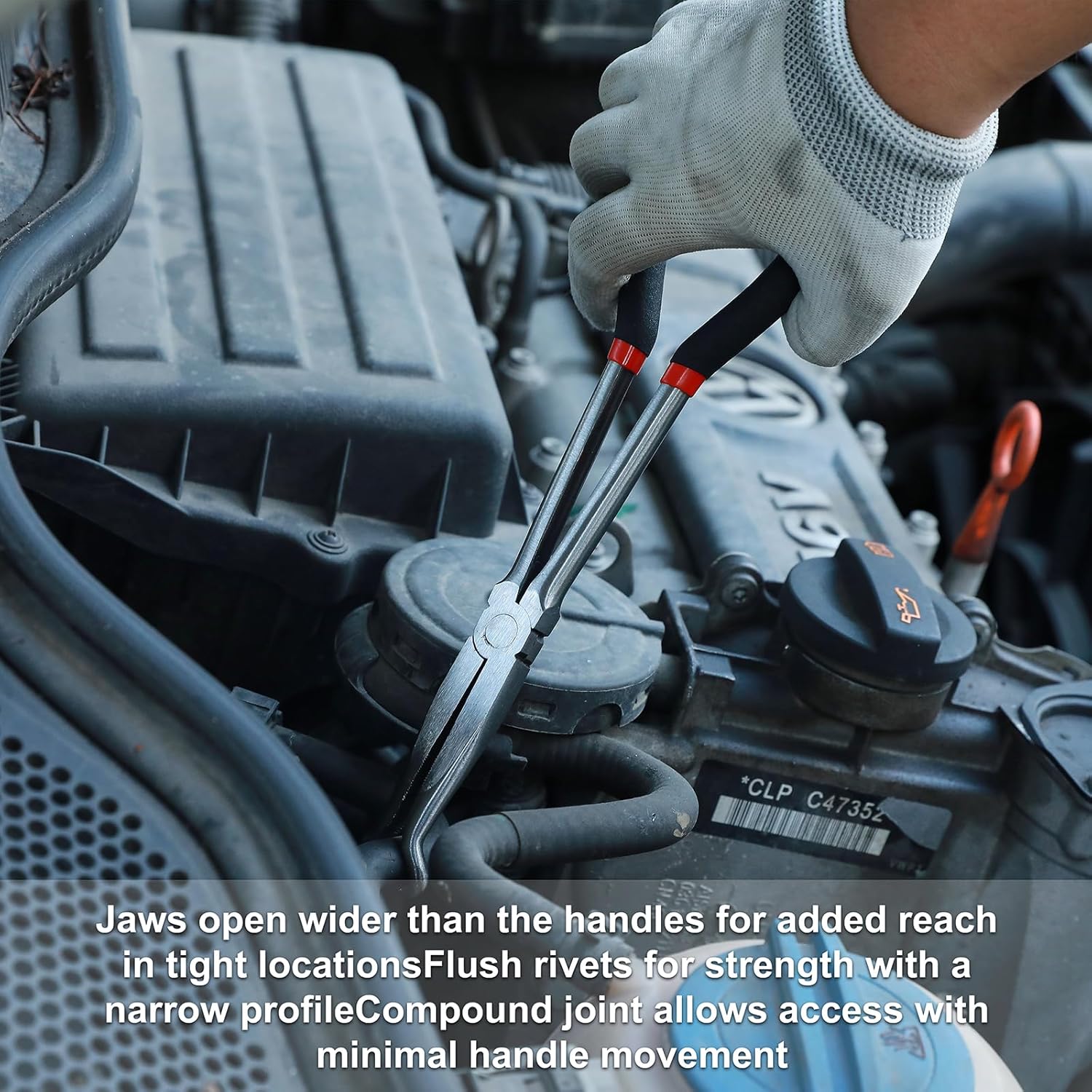 Long reach hose grip pliers are widely used for disassembly and assembly of spark plugs, hoses or other small parts.