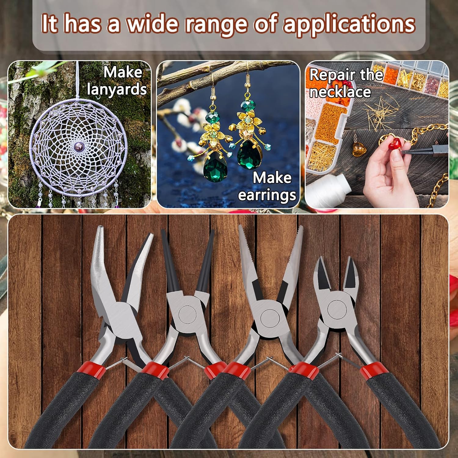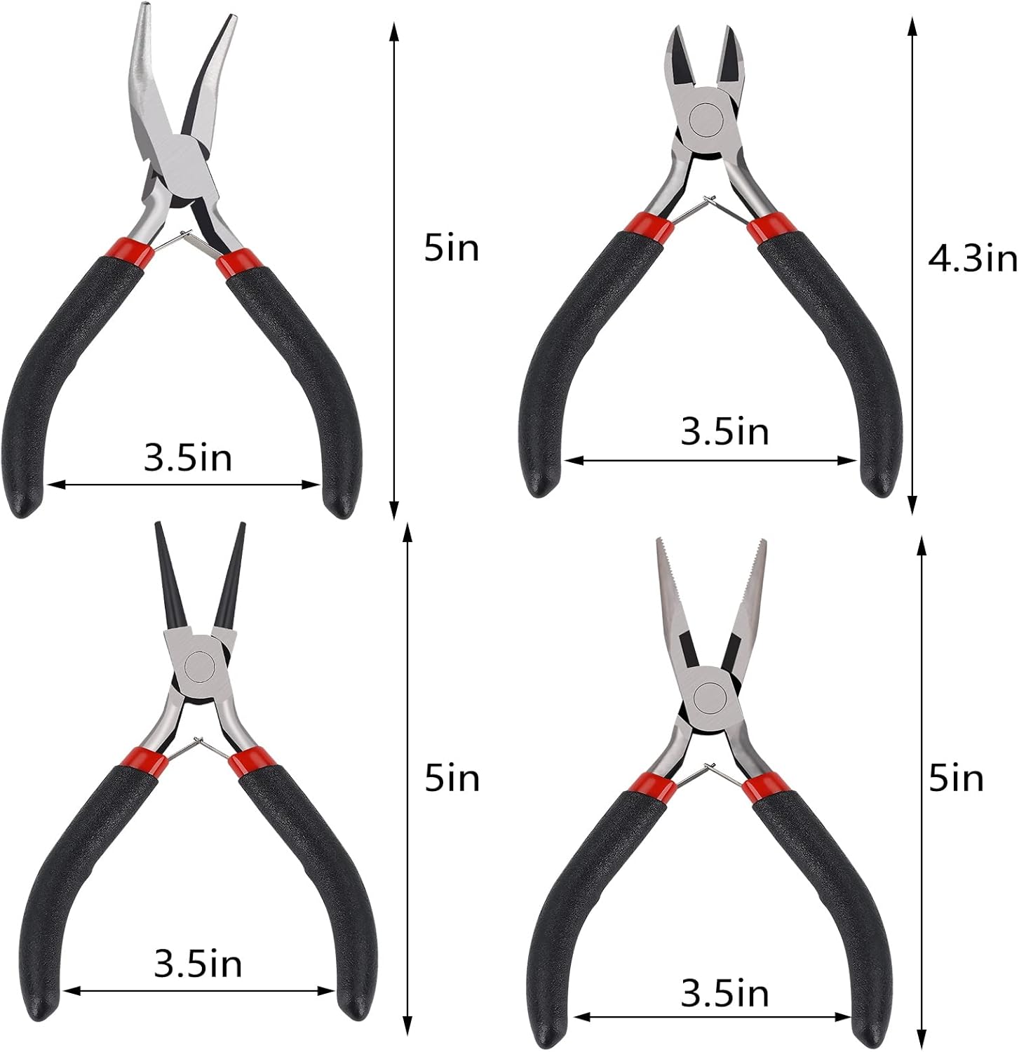 HIGH QUALITY JEWELRY MAKING TOOLS: The jewelry making pliers are made of high quality metal that are sturdy for long time use. Package includes 1 Needle Nose Pliers, 1 Round Nose Pliers, 1 Wire Cutters, 1 Bent Nose Pliers