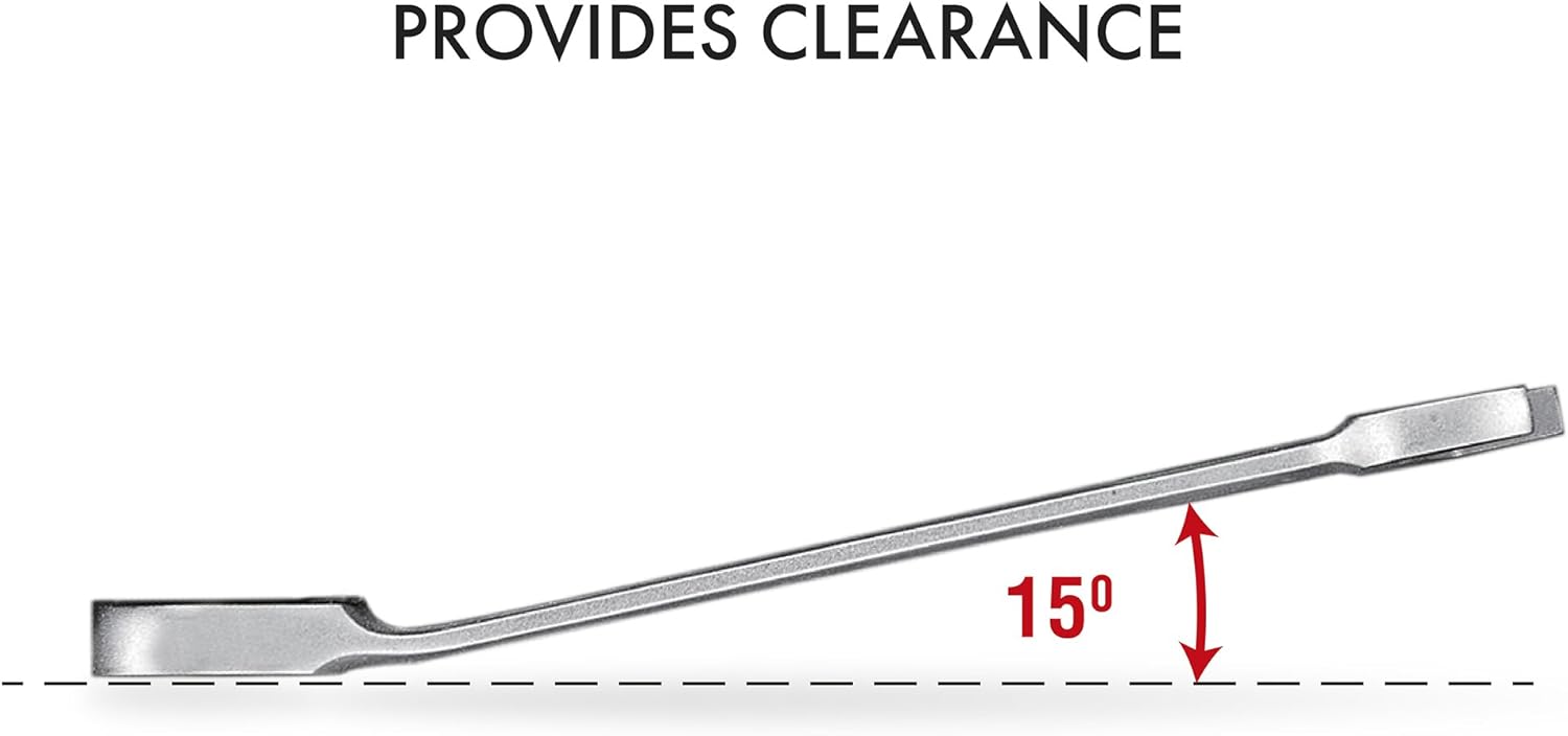 Open end is angled 15 degrees so the wrench can be flipped over to engage fasteners tight spaces