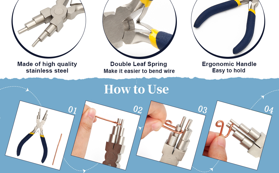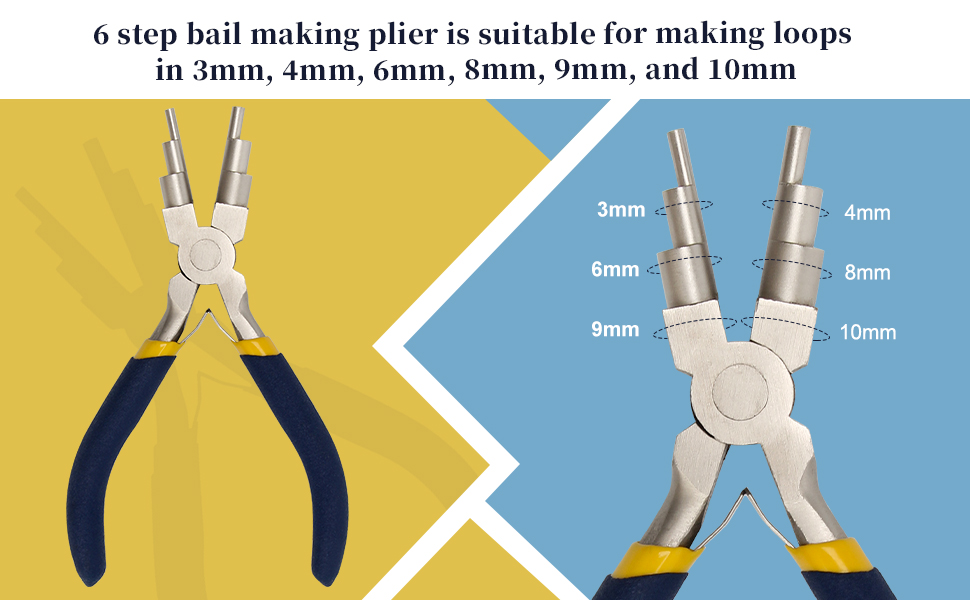 - The 6 in 1 bail making pliers has 6 different sizes for you to make earrings, jump rings, head pins, bend shape, loop wire and other DIY craft