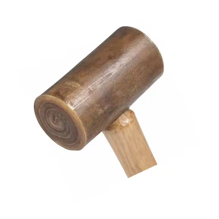 The Mallet head is made using tight rolls of hide (leather) soaked in a resin or Shellac for hardening and put on a wood handle.